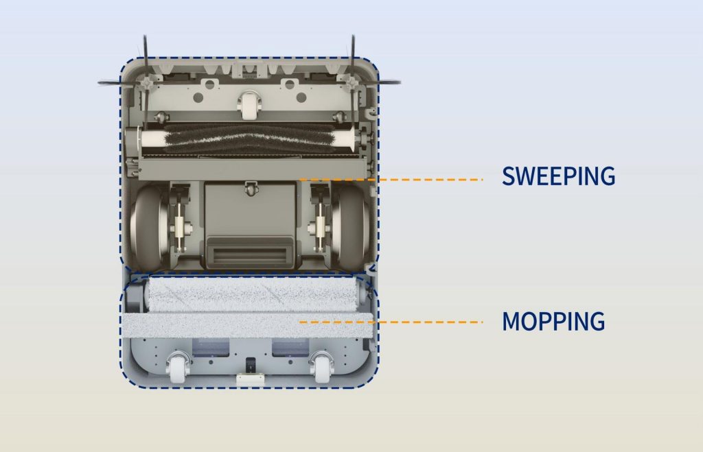 Sweeping unit at the front and mopping unit at the rear separate dry and wet cleaning.